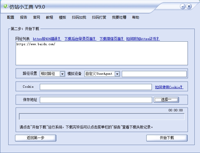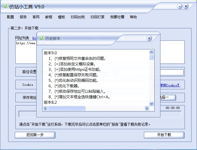 仿站小工具是通过网址下载静态网页的工具。从输入的网址下载html代码,提取出JS、Css、Image、Picture、Flash等静态文件网址,再从下载完好的Css代码中提取出Image静态文件网址,通过网址下载静态文件,根据软件设置好的保存规则,自动修正html和css代码链接路径,最终这些静态文件被按分类保存到电脑文件夹。
