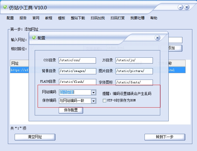 仿站小工具是通过网址下载静态网页的工具。从输入的网址下载html代码,提取出JS、Css、Image、Picture、Flash等静态文件网址,再从下载完好的Css代码中提取出Image静态文件网址,通过网址下载静态文件,根据软件设置好的保存规则,自动修正html和css代码链接路径,最终这些静态文件被按分类保存到电脑文件夹。