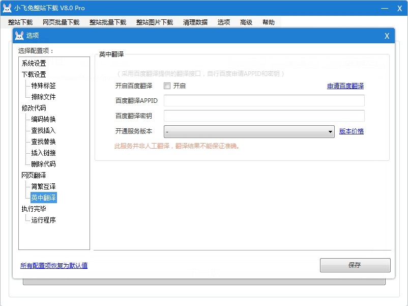 - 将APPID和密钥复制到软件,勾选开启百度翻译,开通服务版本(这个必须和百度翻译开通的版本一致,不能随便选择),点击保存,关闭配置选择。