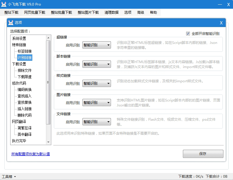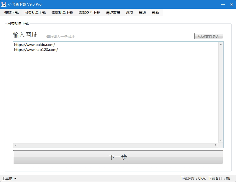 小飞兔整站下载主要功能模块。1、整站下载模块;2、页面批量下载;3、整站批量下载;4、整站图片下载;5、检测网站死链接、6、生成整站链接。