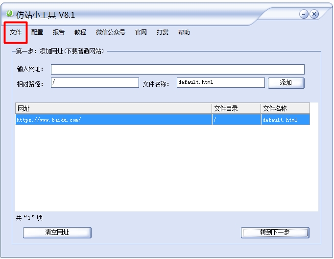 仿站小工具使用说明(一) By admin 发表于 2018-04-17 1、选择下载网站的类型(手机站、PC站)点击菜单栏的“文件”,PC站选择“下载普通网站”,手机站选择“下载手机网站”。 仿站小工具教程索引: 选择下载网站的类型(手机站、PC站) 配置下载文件的保存目录 添加网址及文件存放目录 下载相关配置 登录页面及后台页面解决方法 微信页面下载 下载有失败的链接如何重试 其他问题: 下载HTTPS网址报 “远程服务器返回错误: (400) 错误的请求。” 错误