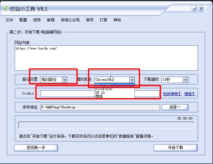 仿站小工具使用说明(四) By admin 发表于 2018-04-17 4、下载相关配置 路径设置:设置代码中的引用文件方式。 模拟抓取:pc端网站仅显示PC的User Agent,手机端仅显示手机端的User Agent,如果选择错了请返回第一步重新选择。 Cooke:登录信息字段。 仿站小工具教程索引: 选择下载网站的类型(手机站、PC站) 配置下载文件的保存目录 添加网址及文件存放目录 下载相关配置 登录页面及后台页面解决方法 微信页面下载 下载有失败的链接如何重试 其他问题: 下载HTTPS网址报 “远程服务器返回错误: (400) 错误的请求。” 错误