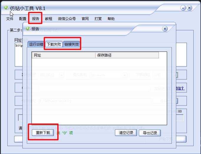 仿站小工具使用说明(七) By admin 发表于 2018-04-17 7、下载有失败的链接如何重试点击菜单栏的“报告”,切换“下载失败”和“链接失效”页签,点击“重新下载”,系统重新尝试下载。 仿站小工具教程索引: 选择下载网站的类型(手机站、PC站) 配置下载文件的保存目录 添加网址及文件存放目录 下载相关配置 登录页面及后台页面解决方法 微信页面下载 下载有失败的链接如何重试 其他问题: 下载HTTPS网址报 “远程服务器返回错误: (400) 错误的请求。” 错误